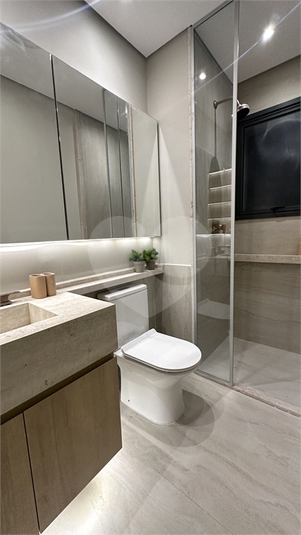 Banheiro funcional: Box de vidro, piso antiderrapante e nichos organizadores.