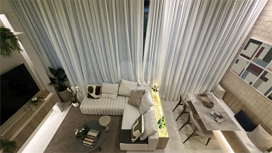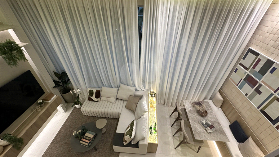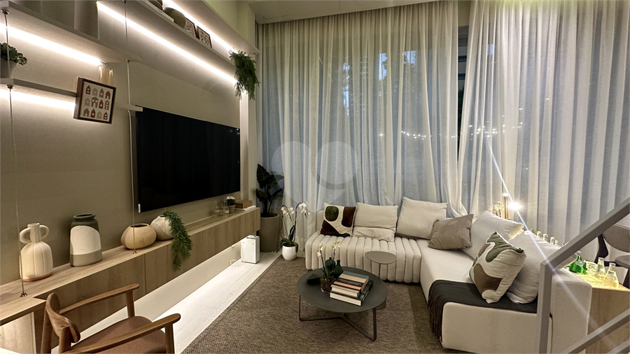 Área de lazer interna: Estar integrado com painéis de TV e iluminação em LED.