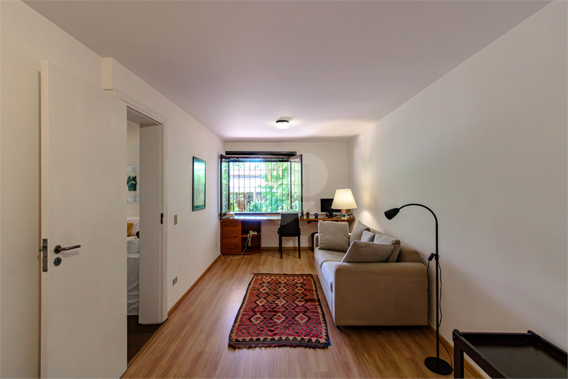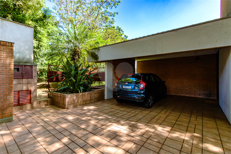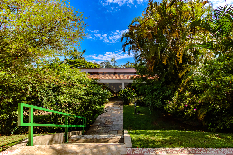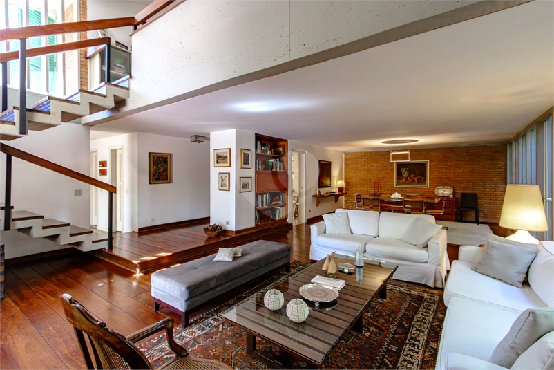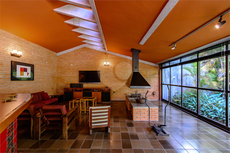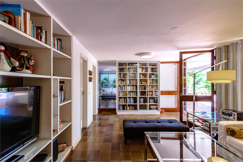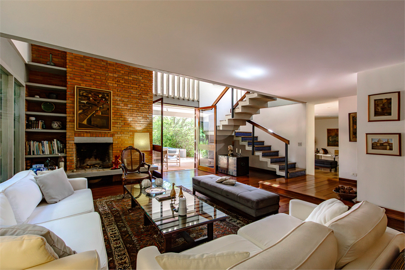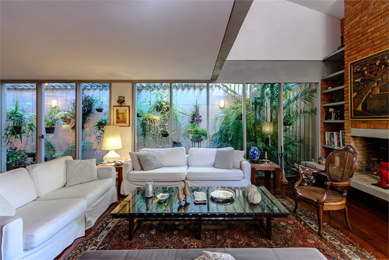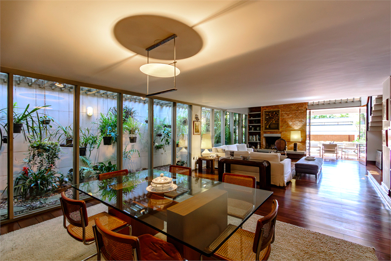 Possui amplo living com lareira, portas de vidro teto-chão na sala de jantar que trazem o verde do jardim de inverno e a iluminação para o ambiente, sala de TV grande e quarto de hospedes que se abrem para área externa.