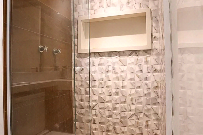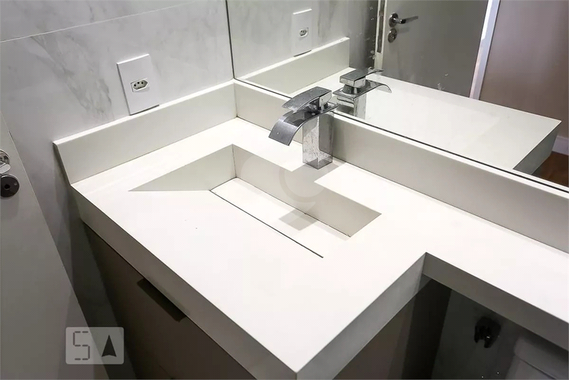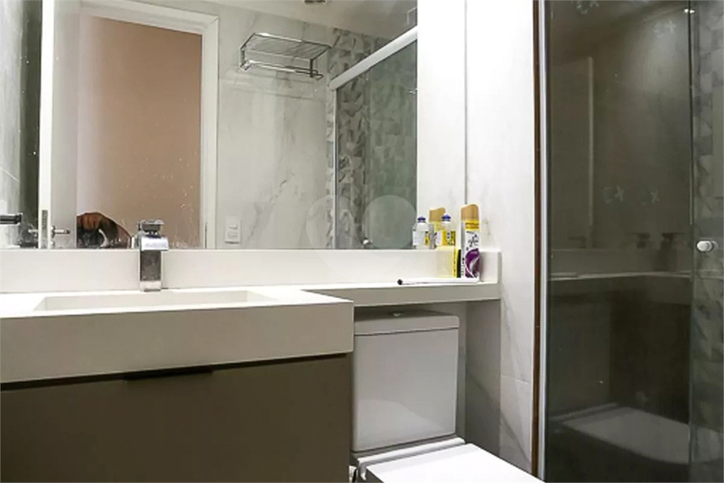 Banheiro com espelho, armário e toalheiro